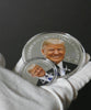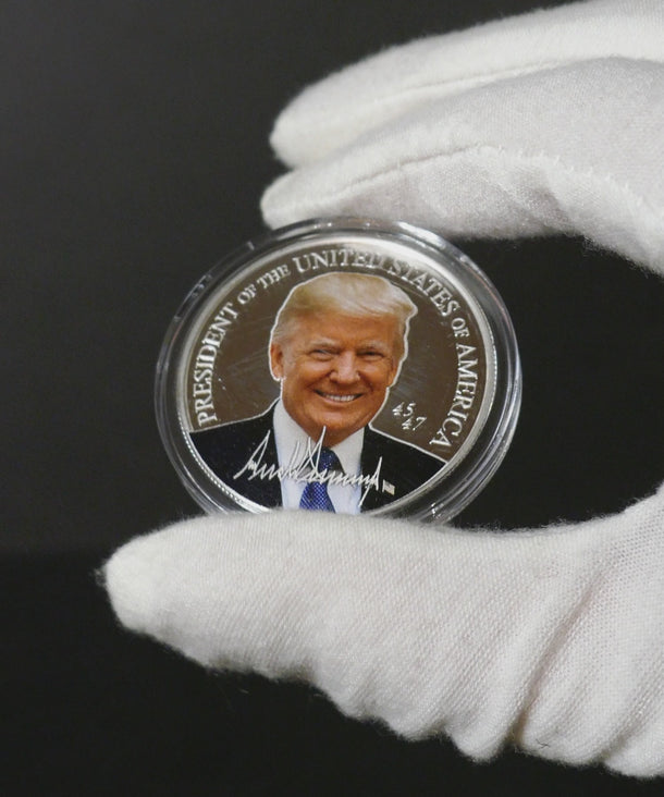 Trump Coins is proud to produce the only and official silver designed by President Donald J. Trump. This .999 fine silver coin is struck with a proof-like finish and features a portrait of the President with "Donald J Trump, President of the United States" etched in silver. Below the text is a photo of our 45th and 47th President’s portrait alongside “45” and “47” etched in the silver, his signature, and his presidential seal. The reverse of the coin features President Trump’s signature etched in silver and a declaration stating this product is Made in the USA encased in a banner of stars.