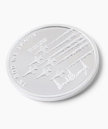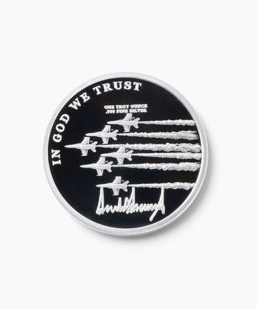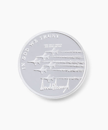 RealTrumpCoins.com is proud to produce the only and official silver designed by President Donald J. Trump. This is a 1oz .999% silver medallion and struck with a proof finish featuring our 45th President’s profile on the obverse and U.S. Navy Flight Squadron on the reverse.