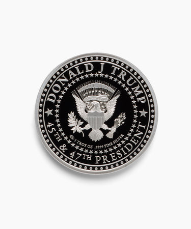 The reverse displays the United States Presidential Seal in fine detail, encircled by stars, surrounded by Donald J. Trump 45th & 47th President. Below, the weight and purity are clearly defined: 1 Troy Oz. .999 Fine Silver. The mirrored background and frosted relief deliver brilliant contrast, showcasing exceptional proof craftsmanship.